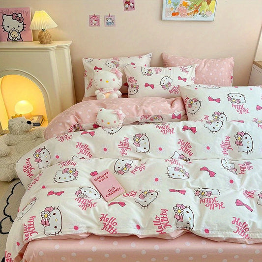 Hello Kitty Pink Duvet Cover Cute Cartoon Pattern Soft Tear Resistant Polyester Bedding Set Suitable for Gift Giving
